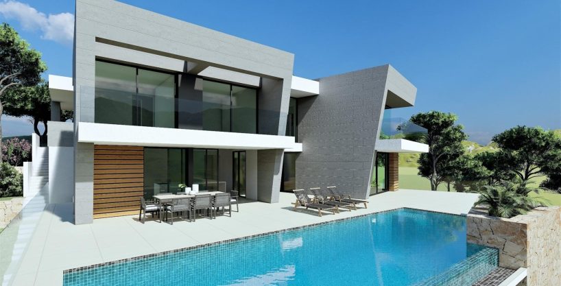New Build modern villa design combines in an elegant and functional way, modern and Mediterranean architecture. On the façade, characterized by large geometrical shapes based on diagonal lines, the colour white dominates and the use of natural stone allows it to blend in with its environment.